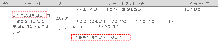 동사는 작년에 국책과제인 '다품종 EV 폐배터리팩의 재활용을 위한 인간로봇 협업 해제 작업 기술 개발'의 참여기관으로 선정된 적이 있다. 한국로봇융합연구원이 주관하는 과제인 이 프로젝트는 작년 22년 4월부터 진행 중에 있으며, 2026년 12월31일까지 진행 될 예정이다.