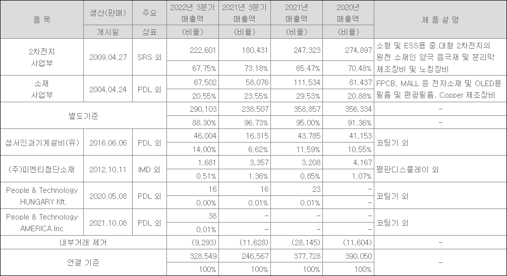 동사는 2차전지를 구성하는 4대 핵심요소들 중에서 음극 및 분리막용 소재 생산에 필요한 장비를 생산하고 있으며, 2차전지 사업부에서의 매출(22년 3분기 기준)이 거의 70%에 육박한다. 소재 사업부는 20.55% 정도로 2차전지 사업 다음으로 규모가 큰 사업분야이다.