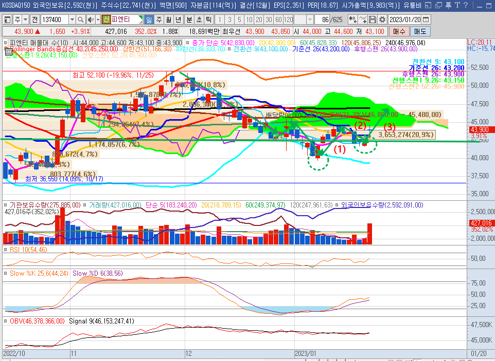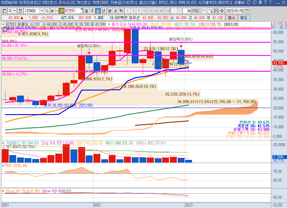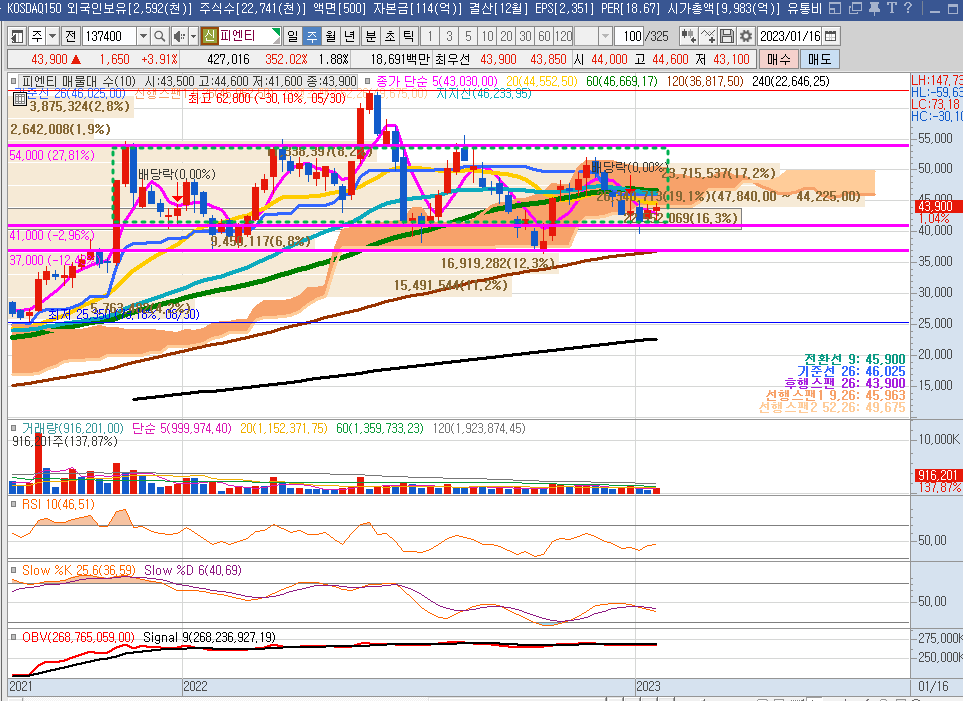 다음으로 피엔티의 주봉차트를 보면, 기존 37,000원대의 지지선에서 저점이 올라와 현재 저점 구간은 41,000원대이다. 주봉으로 볼때 현재 41,000원 하단, 54,000원 상단 박스를 만들어 그 박스 내에서 시세가 형성되고 있고 현재는 그 박스 하단구간에서 상승 모멘텀을 엿보고 있는 상황이다.