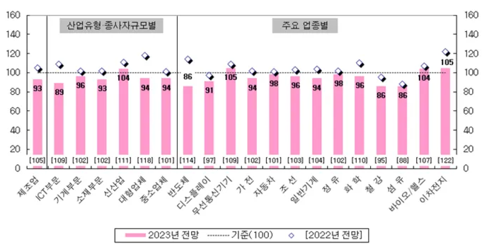 제조업의 주요 유형별 및 업종별 2023년 매출 전망 BSI(기업경기실사지수)