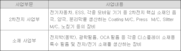 2차전지사업부는 전기자동차, ESS, 각종 모바일 기기 등 2차전지 핵심 소재인 음극, 양극, 분리막을 생산하는 Coating M/C, Press M/C, Slitter M/C, 노칭기 등을 생산하고 있다.