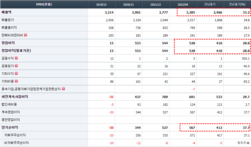 누적실적을 보면, 22년도 3분기 누적 매출은 전년동기 대비 33.2% 상승하였고, 영업이익은28.8% 상승,당기순이익은 37.7%로 역대 최고의 실적을 기록하고 있다.