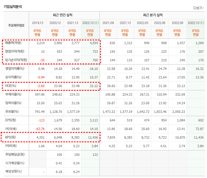 22년도 예상 실적을 보면 매출액은 창립이래 처음으로 4천억대 진출할 것으로 보이며, 영업이익과 당기순이익은 700억대 이상을 기록할 것으로 보인다.