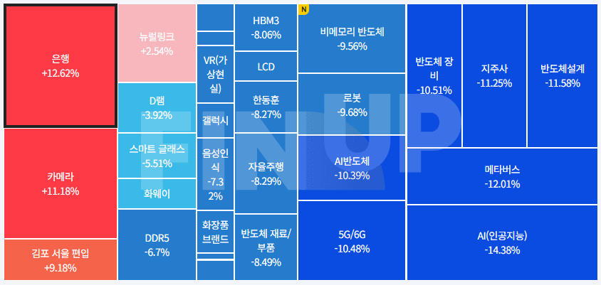 | 약세 테마 | 면역항암제, AI 챗봇(챗GPT 등), CXL(컴퓨트익스프레스링크), 인터넷 대표주, HBM(고대역폭메모리), LED장비, 온디바이스 AI, 시스템반도체, 음성인식, 일자리(취업), 마이크로 LED, 제대혈, 웹툰, 반도체 재료/부품, 3D 낸드(NAND), 의료AI, 4대강 복원, 백신/진단시약/방역(신종플루, AI 등), 마이크로바이옴, 게임, 슈퍼박테리아, 캐릭터상품, 건강기능식품, 영화 등... |
