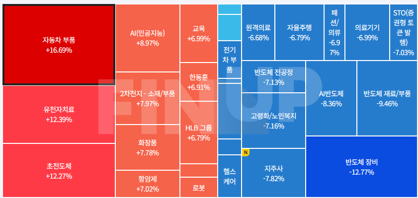 | 약세 테마 | 인터넷 대표주, 은행, STO(토큰증권 발행), CXL(컴퓨트익스프레스링크), 해운, SNS, 카카오뱅크, 온디바이스 AI, 토스(toss), 마이크로 LED, 밥솥, 건설 대표주, HBM(고대역폭메모리), 반도체 대표주(생산), 카지노, 플렉서블 디스플레이, U-Healthcare( 원격진료), 백신여권, AI 챗봇(챗GPT 등), 화폐/금융자동화기기(디지털화폐 등), 전자결제(전자화폐), LNG, 종합 물류 등... |