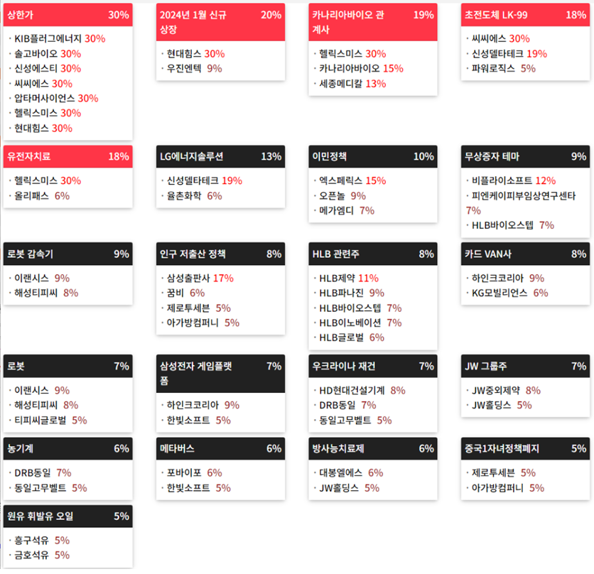 2024년 2월 5일(월) 테마에 따른 종목 상승