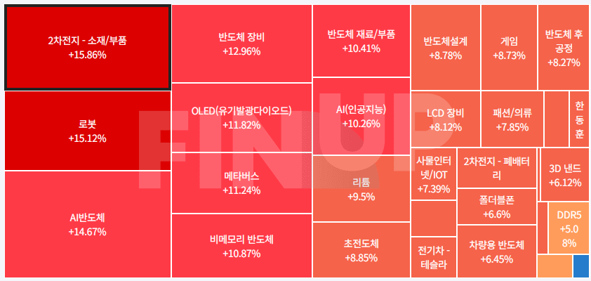 | 강세 테마 | HBM(고대역폭메모리), 온디바이스 AI, CXL(컴퓨트익스프레스링크), 초전도체, 시스템반도체, 제4이동통신, NI(네트워크통합), 리튬, 모바일솔루션(스마트폰), 반도체 장비, STO(토큰증권 발행), LED장비, 웹툰, 로봇(산업용/협동로봇등), 가상화 폐(비트코인 등), SI(시스템통합), OLED(유기 발광 다이오드), 지능형로봇/인공지능(AI), 폴더블폰 등... |