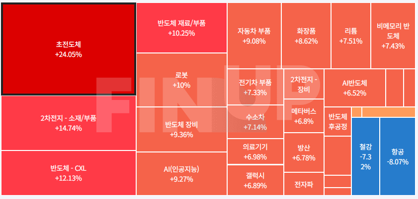 강세 테마 | 초전도체, 로봇(산업용/협동로봇 등), 웹툰, 자전거, 제4이동통신, 스마트팩토리(스마트공장), 보안주(물리), HBM(고대역폭메모리), 국내 상장 중국기업, 공작기계, NI(네트워크통합), CXL(컴퓨트익스프레스링크), SNS(소셜네트워크서비스), 음원/음반, 반도체 장비, 아스콘(아스팔트 콘크리트), 항공기부품, 온디바이스 AI, 4차산업 수혜주 등... |