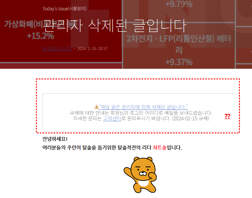 오늘 이상하게도 올릴때 마다 하기와 같이 카카오관리자에 의해 자동으로 글이 삭제되는 오류가 발생하네요;;