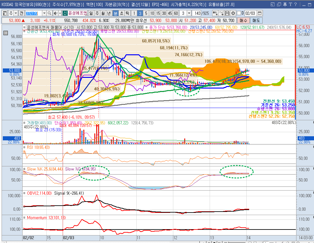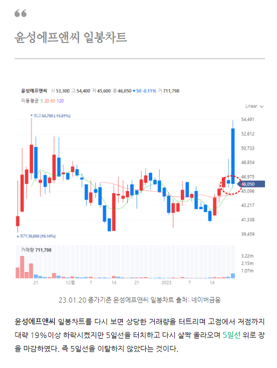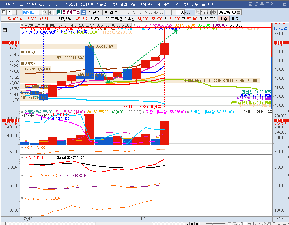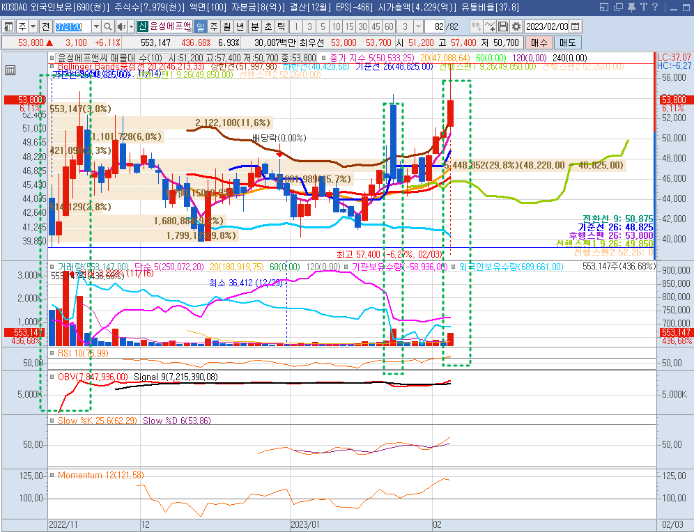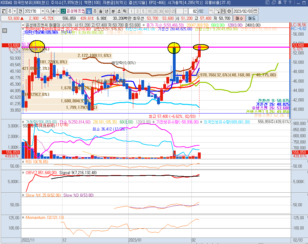 22년 11월 18일에 생겼던 저항 및 23년1월20일에 만들어졌던 53,000원대의 저항대가 지지선으로 바뀌며 윤성에프앤씨의 주가를 컨트롤 하는 세력은 다음 가격대를 준비 중에 있다. 즉 주가가 끝날 구간이 아니라 본격 시작하는 초입구간이라 볼 수 있다.