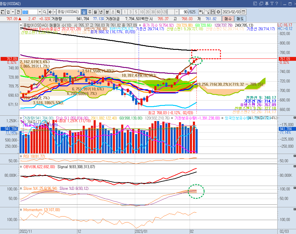허나 현재 코스닥지수의 경우 과열 구간이고 240일선까지 얼마 안 남았다. 보통 240일선을 한 번에 돌파하기는 쉽지 않다. 여전히 불확실한 시장에서 크게 상승할 명분이 없기에 240일선 가까이 다가갈 수록 매도심리가 커져 조만간 조정이 다가올 가능성이 높다.