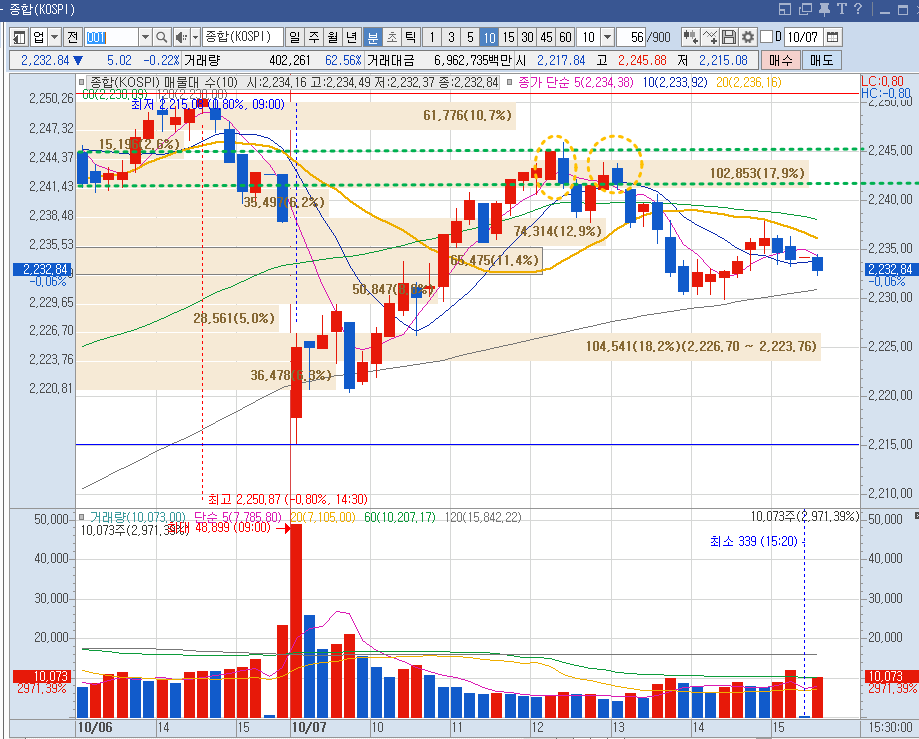 점심 이후부터 지수가 흐리면서, 2,245의 저항을 뚫지 못 하고
