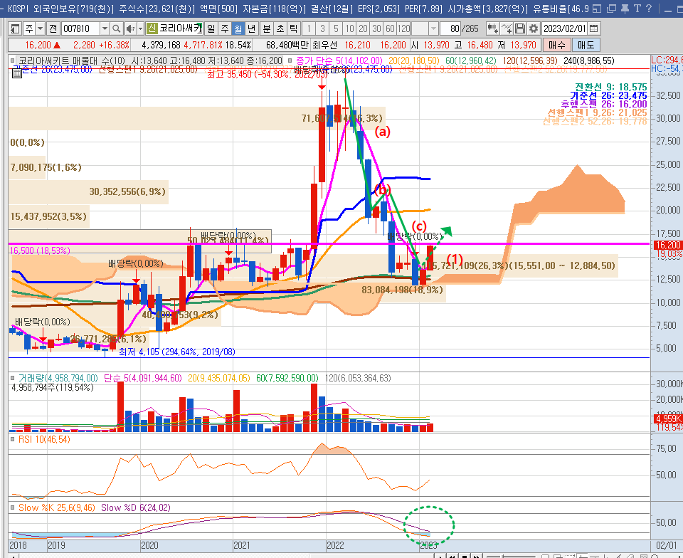 우선 동사의 월봉을 보면, 최근 엘리어트 파동에서 하락파동 (c)파가 마무리되고 다시 상승 (1)파 구간에 놓여있다. 보조지표인 Stochastic slow 를 봐도 주가가 바닥권에 형성되어 있는 것을 보여주며, 현재 16,500원대에 저항이 있지만 실적이 좋아 금세 매물대를 뚫고 돌파하는 움직임을 보일 것으로 예측된다. 실적은 역대 최대이지만 주가는 하단에 위치해 있기에 분할로 접근해도 좋은 구간이다.