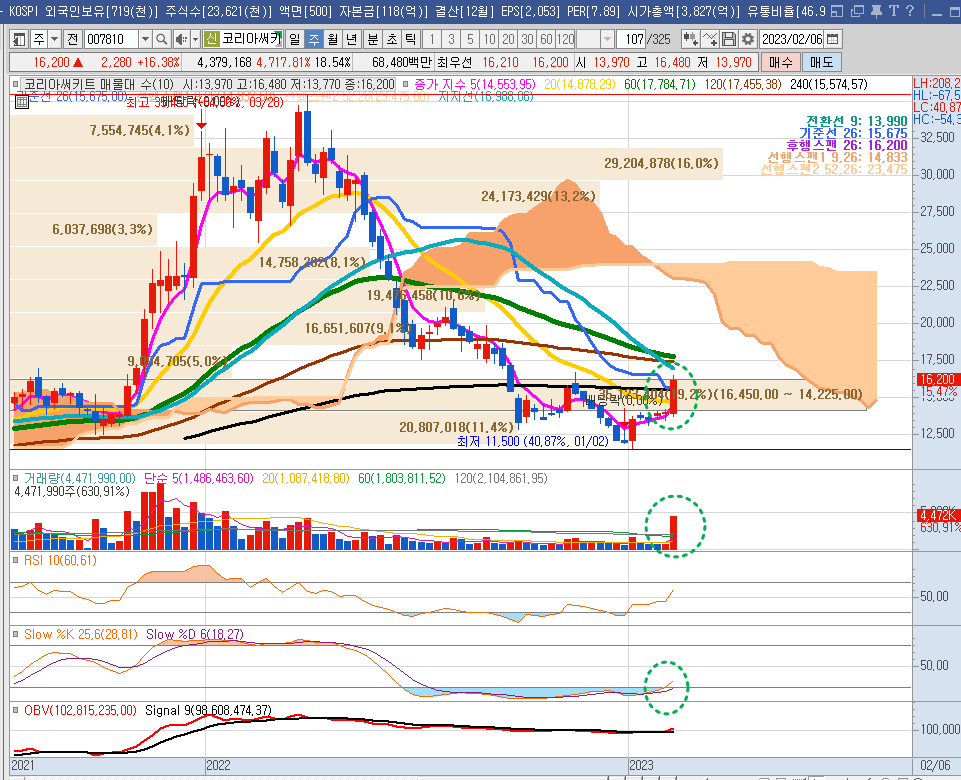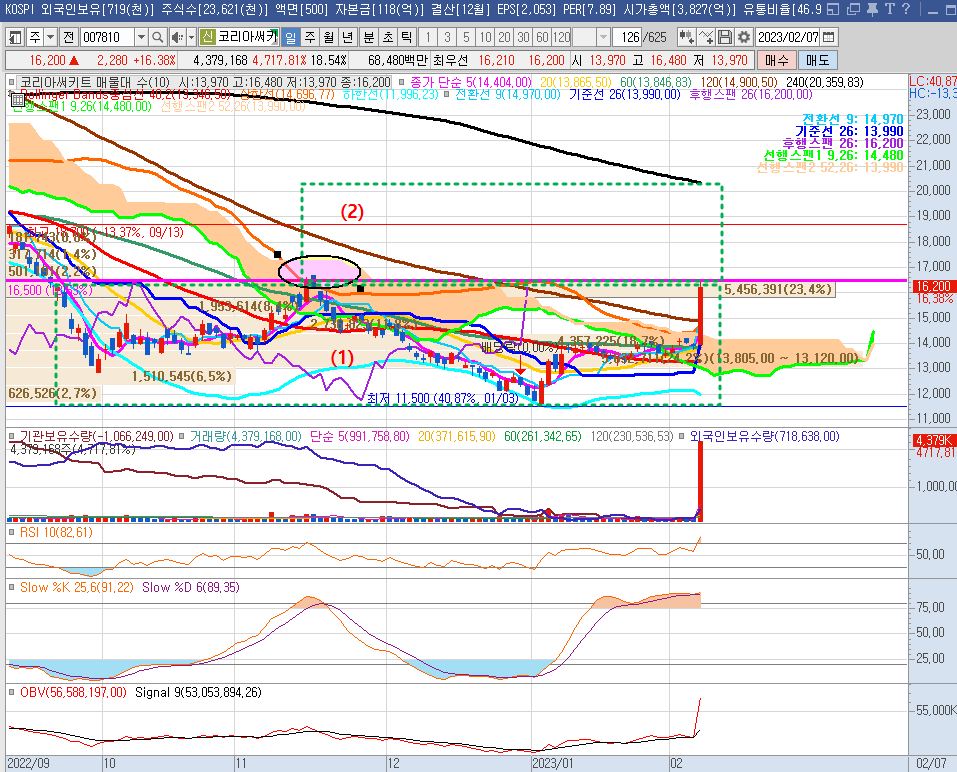 일봉차트를 보면, 현재 (1) 초록박스 구간을 매집구간이라 볼 수 있으며, 22년 11월16일 때의 고점(16,500원대)이 현재의 저항구간이라 금일(2/7)에도 이 저항을 쉽게 뚫고 올라가지 못 했다. 실적이 역대급이기에 저항대는 금세 뚫고 올라갈 것으로 보이며 그 다음으로는 (2) 초록박스 구간에서 가격이 형성될 가능성이 높다.