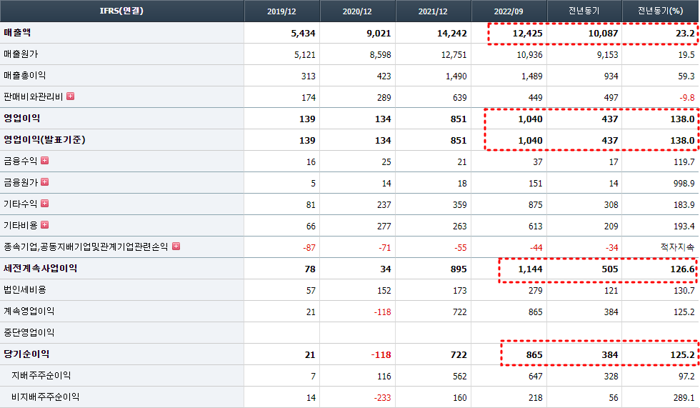코리아써키트의 22년도 3분기 누적치로만 보아도 영업이익은 이미 전년동기 대비 138.0% 나 증가하였고, 세전계속사업이익은 126.6% 그리고 당기순이익도 125.2% 증가로 각각 최소 100%이상을 기록하였는데, 매분기 영업이익이 300억 이상 벌어들인 것을 추세로 볼때 작년(2022년) 사상최대 실적을 기록 할 것으로 보인다.