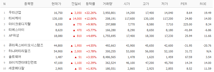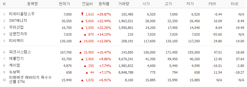 갭상승 종목중에서 전일 고가보다 당일 저가가 높은 종목 Top 10 (24.03.29(금) 종가기준)