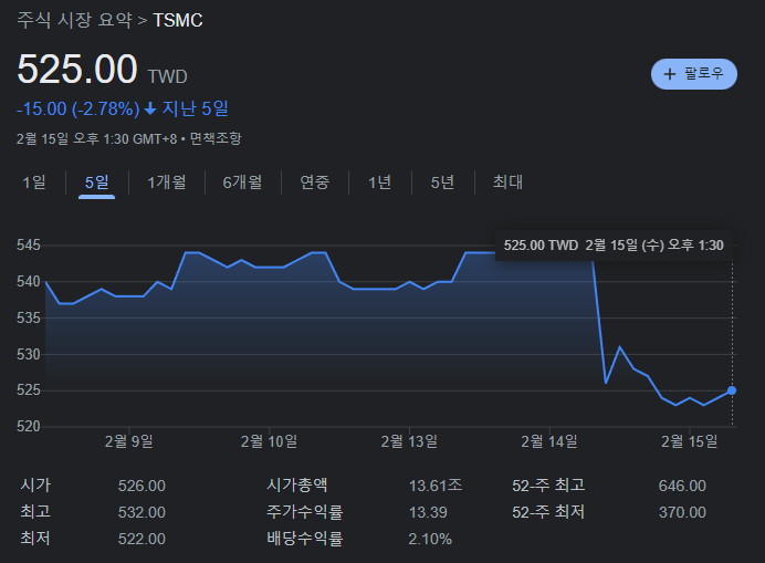 세계 최고급 컴퓨터 칩의 90%를 차지하는 TSMC의 주가는 수요일 3% 이상 하락 마감했다.