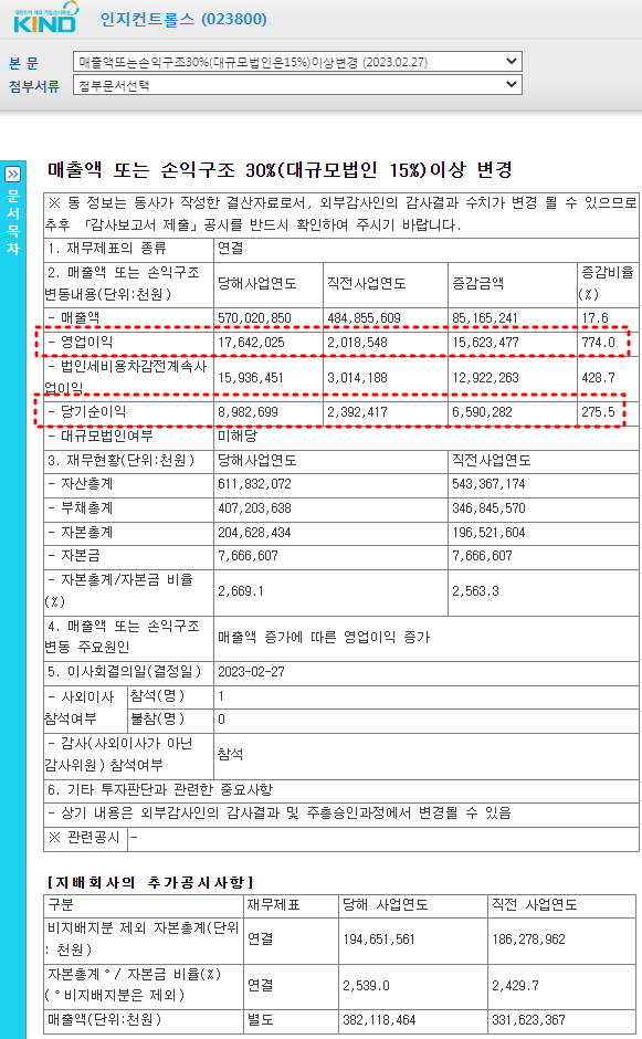인지컨트롤스 22년도 실적발표