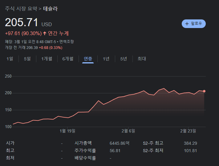 올해 들어 테슬라 주가는 과매도에 따른 반발 심리와 전기차 인하 정책에 따른 판매 상승 기대감에 힘입어 급등했다. 27일 기준 207.63달러(27만 5000원)로 올해 최저점이었던 지난 1월 3일(108.10달러·약 14만 3000원)와 비교해 거의 2배 뛰었기에 자산가치가 높아져 다시 세계 최고 부자 자리에 오를 수 있었다.