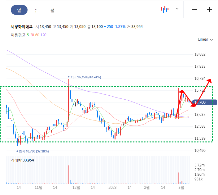 다음으로 세경하이테크 일봉차트를 보면, 주봉차트에서 보았던 (A) 박스 구간을 확대한 것이 바로 일봉차트라 보면 될 것이다. 이 구간은 거즘 세력의 매집 구간으로 보인다. 보통 세력은 N자 패턴으로 주가를 올리는 경향이 크다.