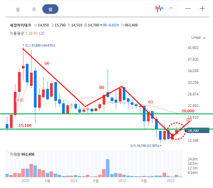 우선 세경하이테크 월봉차트를 보면, 최근 엘리어트 파동 (c) 파를 마무리하였고 다시 상승 (1)파로 전환 중에 있는 단계이다. 매번 돌파하지 못 하던 월봉 5선 저항을 뚫고 올라왔으며 현재 15,100원 금방에서 저항을 받고 조정중에 있다. 그 다음 저항대는 대량 20,000원대이다.