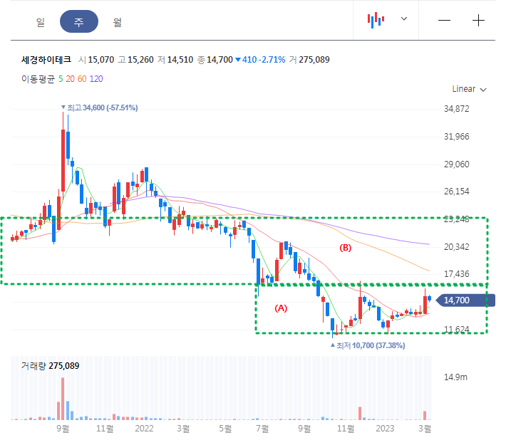 다음으로 세경하이테크 주봉차트를 보면, 현재 (A) 초록 박스 구간에 위치해 있고 이 박스의 상단은 16,100원 정도 하단은 11,100원 정도 이다. 조만간 이차전지 사업 본격 진출이라는 기사가 등장 할테고 그러면서 주가는 (B)구간에서 형성될 가능성이 높다.