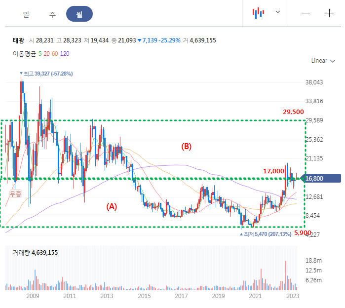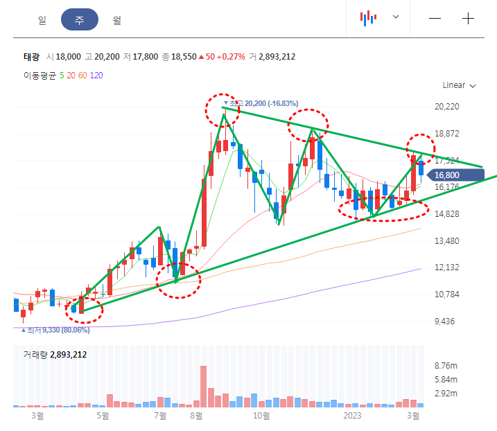 태광 주봉차트를 보면, 전반적으로 우상향 그림을 그리고 있으며, 주봉 60선을 이탈하지 않은채 상승하고 있다. 추세선을 보면 22년도 9월 및 11월의 쌍봉 저항대를 받고 내려왔는데 삼각형이 점차 작아지면서 꼭지부분으로 다가감에 따라 저항대 돌파 준비를 하고 있는 흐름이다.