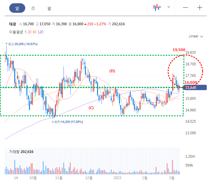 마지막으로 태광의 일봉차트를 보면, 최근 (C) 박스 구간에서 매집을 한 흔적을 볼 수 있으며, 현재 (D) 박스구간에서 16,800원대 부근에서 지지를 받고 있다. 최근 5일선을 이탈하면서 가격조정이 진행 중이지만, 일봉 120선을 이탈하지 않는 흐름이다.