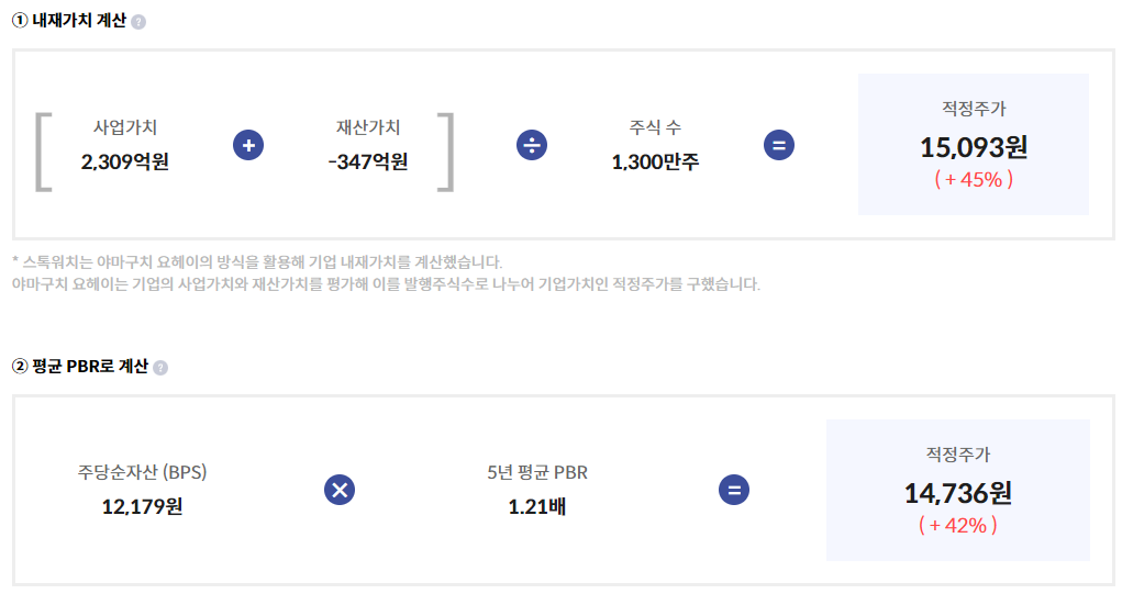 향후 수주가치가 기대되는 가운데 현재 원방테크의 주가를 내재가치와 평균 PBR로 계산해볼 때 평균 14,914.5원정도로 앞으로 상승여력이 43.68%정도 남은 상황이다. 최소 14,000원 위에서 놀아야할 주가가 현재 10,000원 초반대 이기에 관심을 가져보면 좋을 것이다.