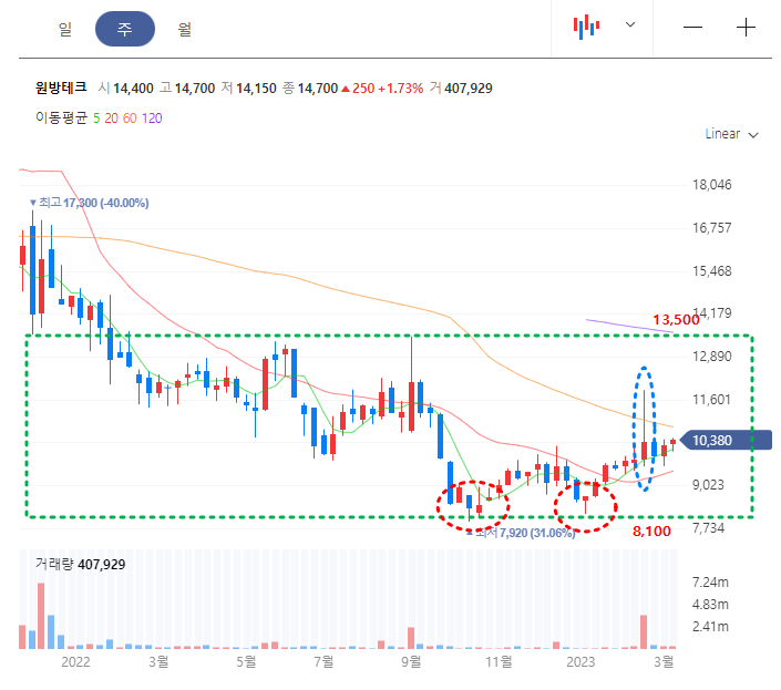 다음으로 원방테크 주봉차트를 보면, 현재 상단 13,500원대, 하단 8,100원대의 초록박스 안에서 주가가 형성되고 있는 것을 알 수 있다. 작년 10월 및 올해 1월 초에 쌍 바닥을 형성하였고 1월 중순을 지나 주봉 20선을 돌파한 이후부터는 추세가 우상향으로 전환되었다.