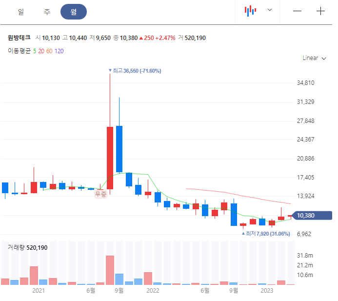 우선 원방테크의 월봉차트를 보면, 최근들어 월봉 5선위로 안착한 흐름을 볼 수 있다. 최대실적을 기록했음에도 불구하고 주가는 바닥권에 있기에 분할로 접근을 하더라도 부담이 없는 구간이다.