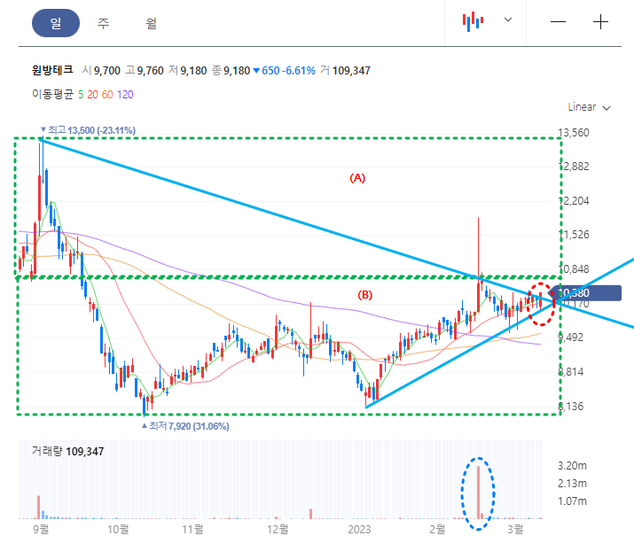 끝으로 원방테크 일봉차트를 보면, 1월 초에 바닥을 형성한 이후로 큰 추세 이탈없이 상승세에 있다. 삼각형 상단 빗면 저항대를 돌파하려는 움직임을 2월 15일에 보였지만 이내 다시 내려왔고 가격 및 기간 조정을 거치고 지난 금요일(3/10)에 다시 고개를 들었다. 즉, 여전히 상승추세가 꺾이지 않았다는 것을 보여주고 있다.