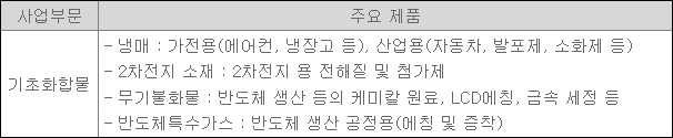 참고로, 회사의 냉매, 2차전지 소재, 무기불화물, 반도체 특수가스 등의 기초화합물 화학소재는 삼성전자, SK하이닉스 등 유수의 국내 및 해외 전방 가전사, 반도체 생산 업체, 전해액 Maker 업체 등으로 판매되고 있다.