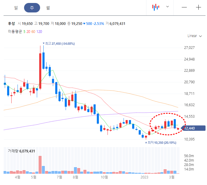 2차전지 소재 관련주 후성 주봉차트