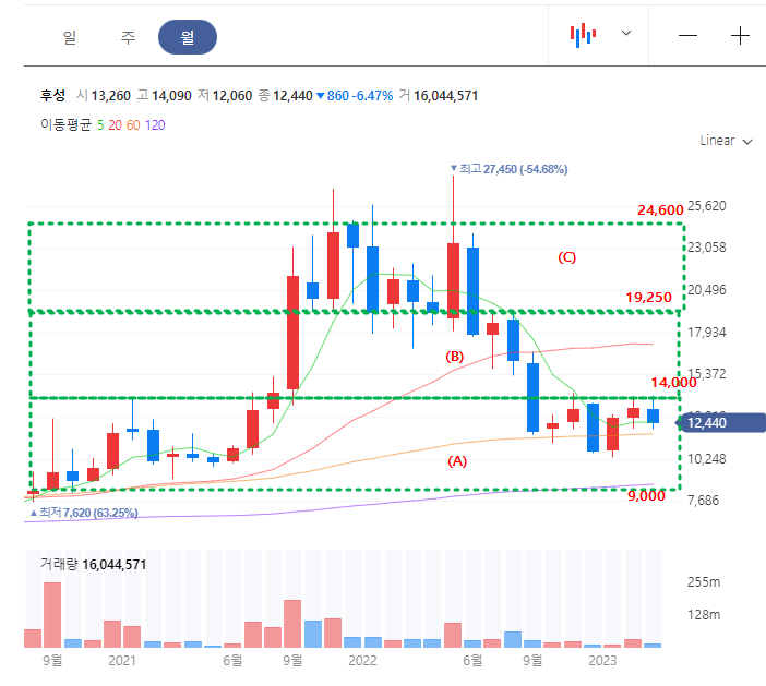 우선 후성의 월봉차트를 보면, 3단계 박스로 나눠 볼 수 있다. 현재는 (A) 박스구간에서 시세를 형성하고 있으며 조만간 14,000원대의 저항대를 뚫고 올라가 (B) 박스구간에서 주가가 움직일 가능성이 높다. 역대급실적을 기록했음에도 불구하고 21년도때의 주가와 비슷하게 형성되어 있으니 주가가 레벨업하는 것은 시간문제이다.