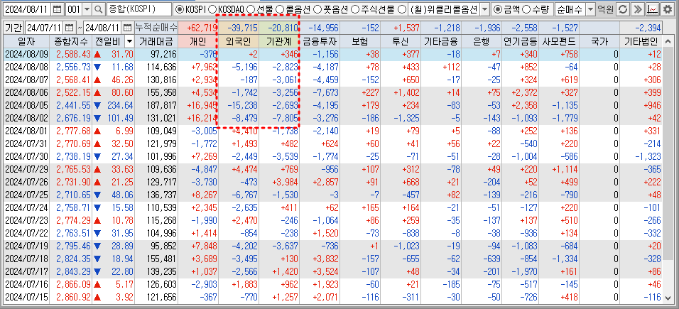 차주 코스피가 약세일 것으로 보는 이유는 아직 외국인과 기관이 적극 매수세로 들어오지 않았다. 지수가 상승하려면 최소 3일연속으로 외국인 매수세가 들어오는걸 체크해두면 좋다. 지금 관심사는 아무래도 7월 美CPI 와 소매판매, 8월 미시간대 소비자신뢰지수 인데, 美 CPI 둔화가 나타날 경우 경기 악화 시그널로 해석될 수 있고 이러한 불확실한 이벤트가 남아있기에 외인들의 매수세가 저조한 것으로 보인다.