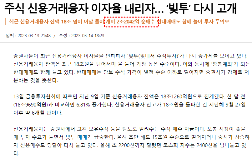 신용잔고가 급속도록 늘어나는데 이는 증시가 상승하는데 있어 큰 발목을 잡게 된다. 세력은 반드시 이러한 신용매수를 꺾고 올라간다. 세력은 절대로 자원봉사자가 아니기에 빚투한 개미들을 떨구기 위해 증시를 하락시켜 반대매매를 초래하는 경우가 많다. 따라서 빚투한 사람들에게는 큰 고난이 될 수 있다.