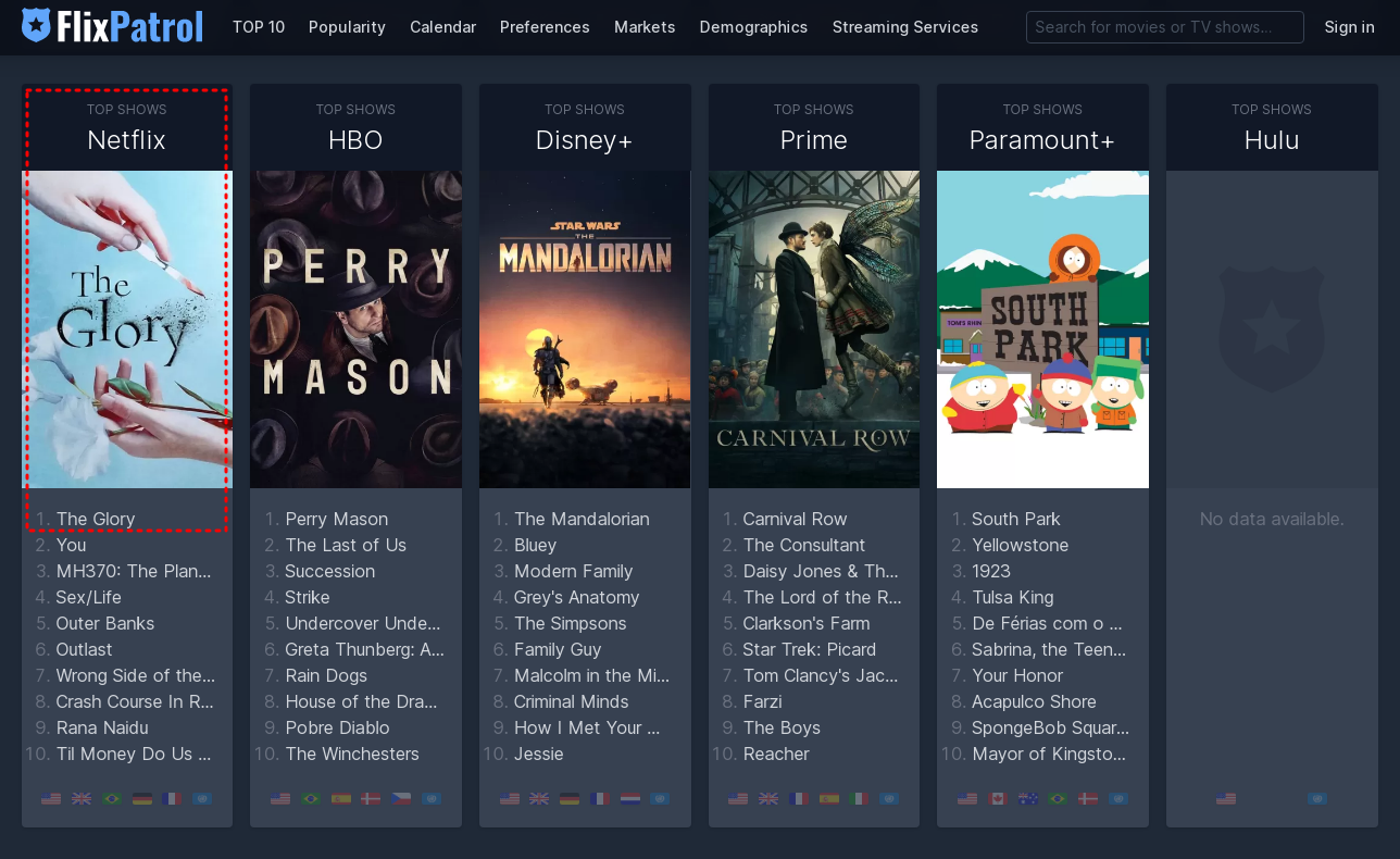 플릭스 패트롤(Flixpatrol)를 보면 전세계에 있는 Top 10 스트리밍 순위를 볼 수 있는데, 현재 3월 15일 오전 10시 30분에 찾아가서 확인해봐도 여전히 Top Shows 부분 '더 글로리' 가 압도적으로 1위 이다.