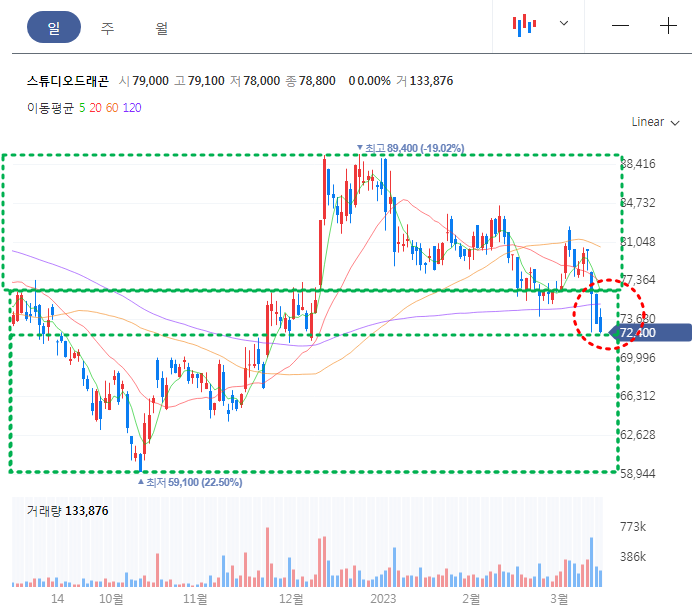 우선 스튜디오드래곤 월봉차트를 보면, 2018년 이후 전반적으로 하락추세가 최근까지 이어지면서 크게 시세를 형성하지 못하는 흐름이다. 59,500원대에서 지지를 받고 있으며,초록선 상단의 저항대를 제대로 돌파하지 못 하는 흐름이다.