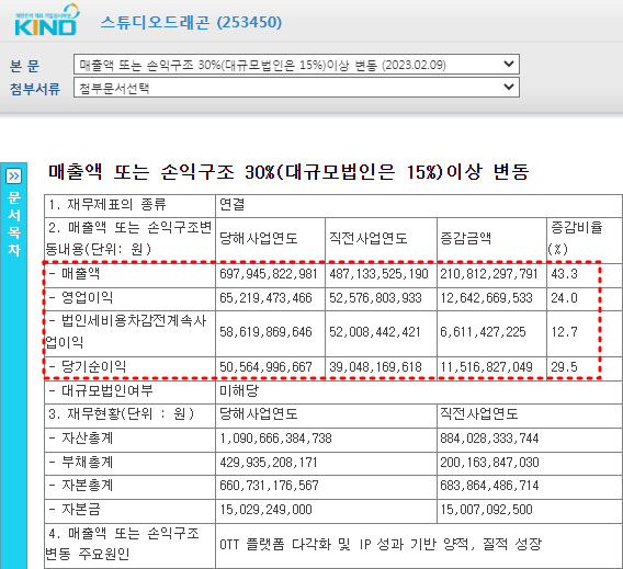 스튜디오드래곤의 작년실적을 보면, 매출액은 전년比 누적 43.3% 증가하였고, 영업이익은 652.19억으로 24.0% 증가했고, 당기순이익은 505.65억으로 29.5% 증가했다. 작년에 OTT 플랫폼 다각화 및 IP 성과가 좋았고 전반적으로 양적 및 질적으로 성장하면서 매출로 연결되었기 때문이다.