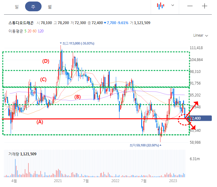 스튜디오드래곤 주봉차트를 보면, 크게 (A), (B), (C) 그리고 (D) 구간으로 나눠서 볼 수 있으며, 각 박스구간을 이동하는 경계선이 저항이자 지지선으로 작용할 가능성이 높다. 현재는 72,000원 초반에서 지지를 받고 있으나, 명확하게 방향성이 모호하기에 분할로 접근하는게 좋을 듯 싶다.