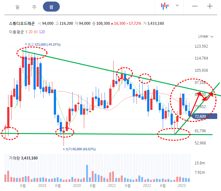더글로리 관련주 스튜디오드래곤 월봉차트