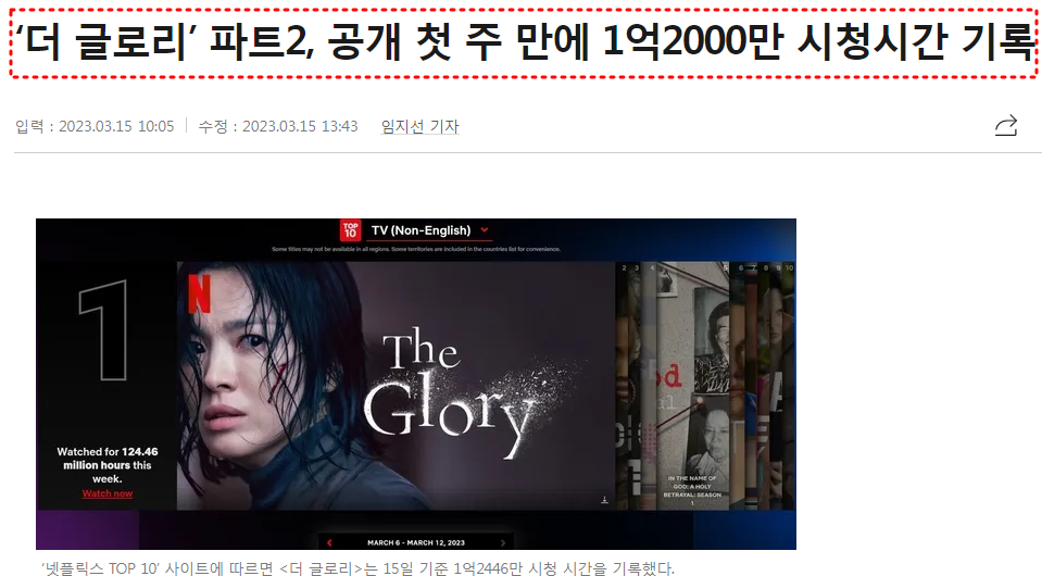 3월 10일에 공개된 더 글로리 시즌 2가 전 세계에서 핫하다. 작일(14일) 온라인 콘텐츠 서비스 순위 집계 사이트 ‘플릭스 패트롤’에 따르면 넷플릭스 시리즈 ‘더 글로리’는 전날 기준으로 넷플릭스 TV 프로그램 부문 전 세계 1위에 올랐다.
