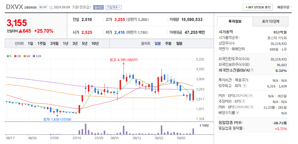 DXVX | 3,155 | +25.70% | 470억 7,900만 | 개발중인 경구용 비만치료제가 후기 임상 대조 물질 대비 우월한 효과를 확인하면서 관련주로 부각 |