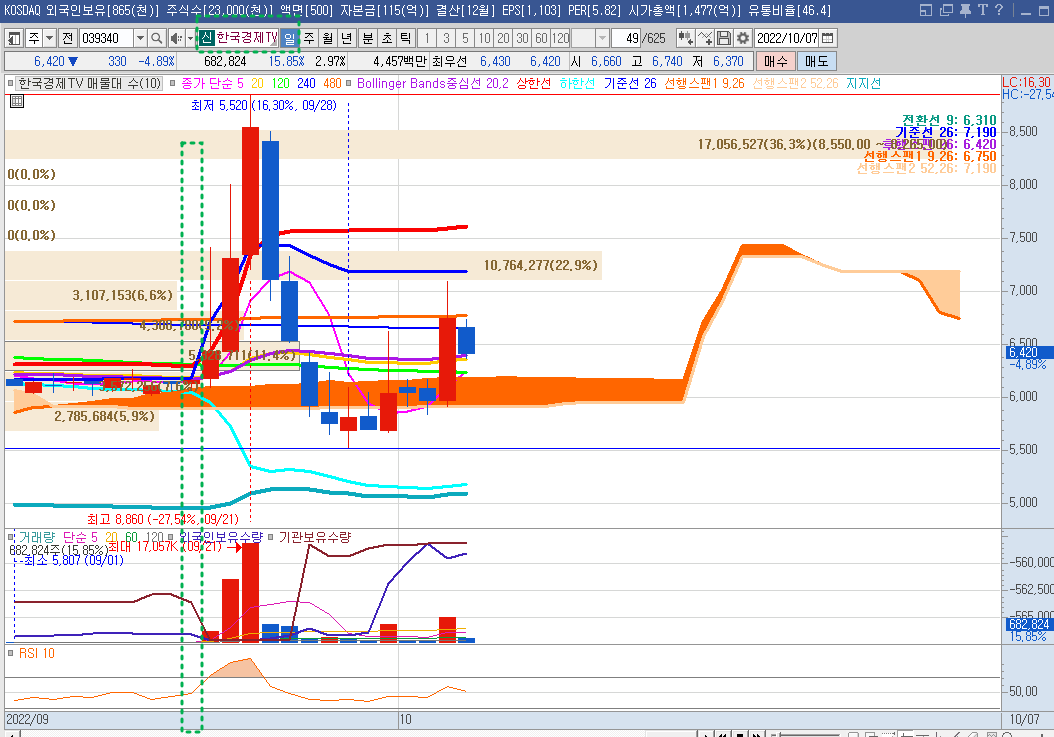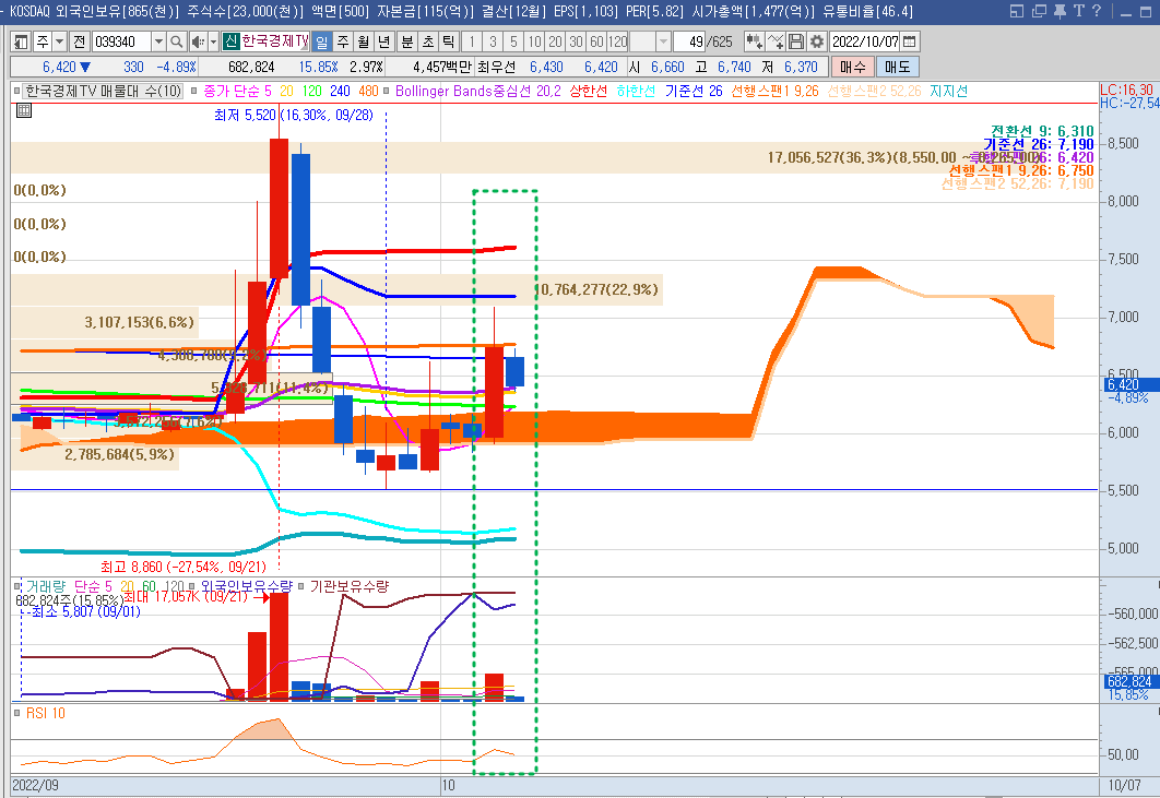 공교롭게도 9월16일(초록박스) 주식등의 대량보유상황보고서 공시된 날(9/16)의 다음 거래일(9/19) 부터 주가가 40%이상 상승하였다가, 최근 조정을 받고 다시 상승 추세로 전환하였다.