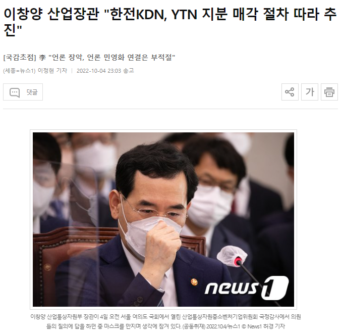 이창양 산업통상자원부 장관은 10월4일 한국전력공사 자회사인 한전KDN의 YTN 지분 매각과 추진과 관련해 "공공기관 혁신 가이드라인에 따라 추진하겠다"고 매각 추진 의사를 분명히 했다.