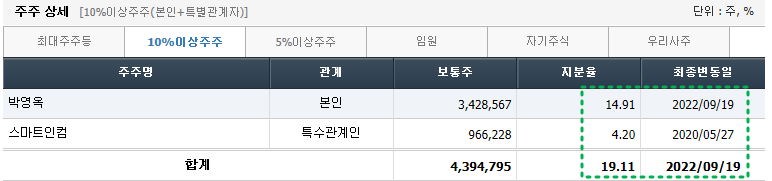 스마트인컴은 주식농부 박영옥 대표의 회사로, 그의 지분은 9월19일 기준 19.11% 정도 된다.