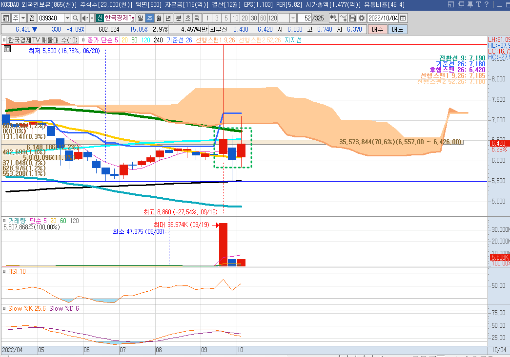 현재 20주봉 위에서 이탈하지 않고 있으며, 금리인상압박으로 인해 증시가 조정받을 때 수급이 이런 지분이슈 종목 쪽으로 몰릴 가능성이 높다.