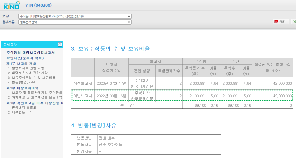 한국경제신문은 지난 9월 16일 YTN 주식 6만910주를 매수했다.