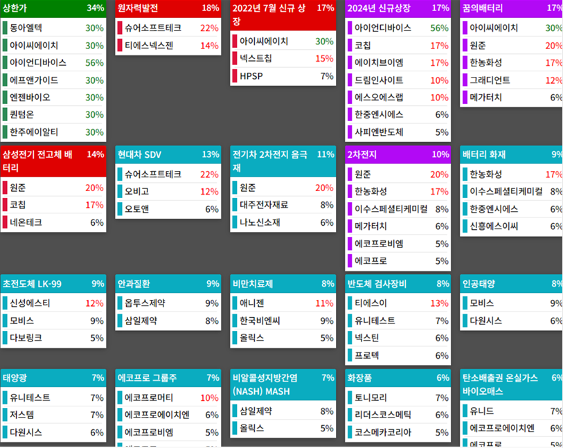 21. 그래디언트(11.96%) : 삼성전기, 초소형 전고체 배터리세계 최초 개발 소식 속 전고체 배터리 필수 재료 황화리튬 생산업체인 정석케미칼 사실상 최대주주로 부각되며 급등